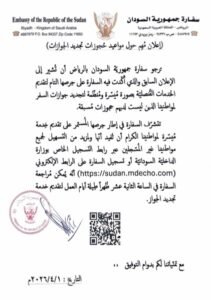 أشارت سفارة السودان بالرياض إلى أن الإعلان السابق الذي أكدت فيه حرصها التام لتقديم الخدمات القنصلية بصورة ميسرة ومنظمة لتجديد جوازات السفر للمواطنين الذين ليست لديهم حجوزات مسبقة.