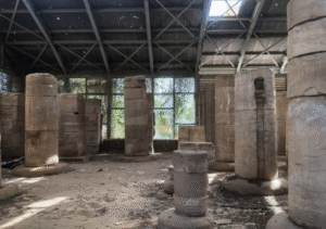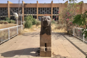 في مدخل المتحف، تحوّلت الحديقة التي كانت تضمّ أشجارا نادرة ونموذجا مصغّرا لنهر النيل إلى ساحة يملؤها العشب الجاف، محاطة بتماثيل آلهة الحرب الكوشية، فيما يحمل السقف آثار قذائف.