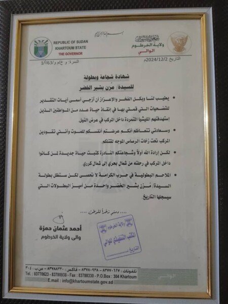 فخر ما بعده فخر أن يكرمني هذا الرمز السوداني الشجاع، الاستاذ أحمد عثمان حمزة والفخر كله في تشريفه لنا، حيث قال أن هذه بطولة نادرة في حرب الكرامة وقام بتكريمي ومنحي هذه الشهادة التي اعتبرها تاريخ لشخصي وللتاريخ السوداني فله ولكل أعضاء حكومته التحية ،، ونسأل الله ان ينصر قوات شعبنا المسلحة على هذا العدو الغاشم الذي جثم على صدور الشعب السوداني في غفلة من الزمن ..