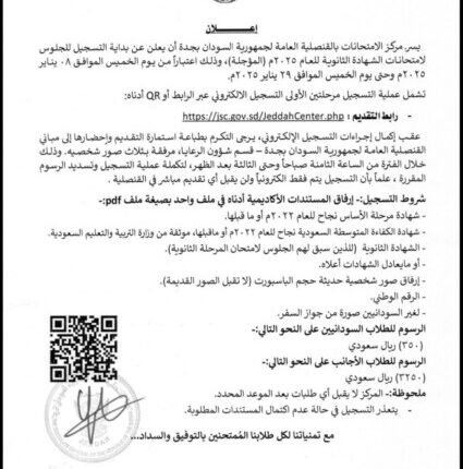 أعلنت القنصلية العامة لجمهورية السودان في جدة بالمملكة العربية السعودية عن بداية التسجيل للجلوس لامتحانات الشهادة الثانوية للعام 2025 المؤجلة اعتبارا من اليوم الخميس 8 يناير وحتى الخميس الموافق 29 يناير الحالي.