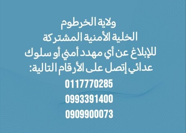 نشرت المنصة الإلكترونية التابعة لحكومة ولاية الخرطوم أرقام للتواصل مع الخلية الأمنية المشتركة للإبلاغ عن أي مهددات أمنية أو سلوك عدائي.