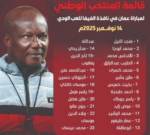 أعلن المدير الفني للمنتخب القومي السوداني كواسي ابياه قائمة المنتخب التي ستواجه منتخب عمان في فترة التوقف الدولي وضمت القائمة ٢٣ لاعبا بقيادة منجد النيل والطيب عبد الرازق ومحمد الرشيد والجزولي نوح وابوعاقلة عبد الله وبخيت خميس  وشهدت القائمة استبعاد خماسي الهلال والي الدين خضر وصلاح عادل وعبد الرؤوف يعقوب ومحمد أحمد ارنق ومحمد عبد الرحمن بالتنسيق مع الجهاز الفني للهلال الذي يستعد لمواجهة مولودية الجزائر في الثاني والعشرين من نوفمبر الجاري بدوري أبطال أفريقيا