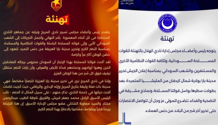 حرص فريقا القمة على تهنئة الشعب السوداني والقوات المسلحة الباسلة والقوات المساندة لها في معركة الكرامة بمناسبة تحرير مدينة بارا بعد معركة حاسمة قدم من خلالها جنودنا البواسل كل معاني التضحية والفداء نصرة للوطن وللشعب وجاءت التهنئة عبر الصفحتين الرسميتين للفريقين على موقع التواصل الاجتماعي فيسبوك