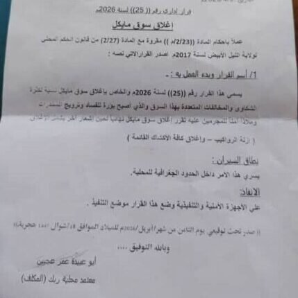 قررت السلطات في محلية ربك بولاية النيل الأبيض، اليوم السبت 11 أبريل 2026، إغلاق “سوق مايكل” نهائيًا بسبب كثرة الشكاوى والمخالفات.