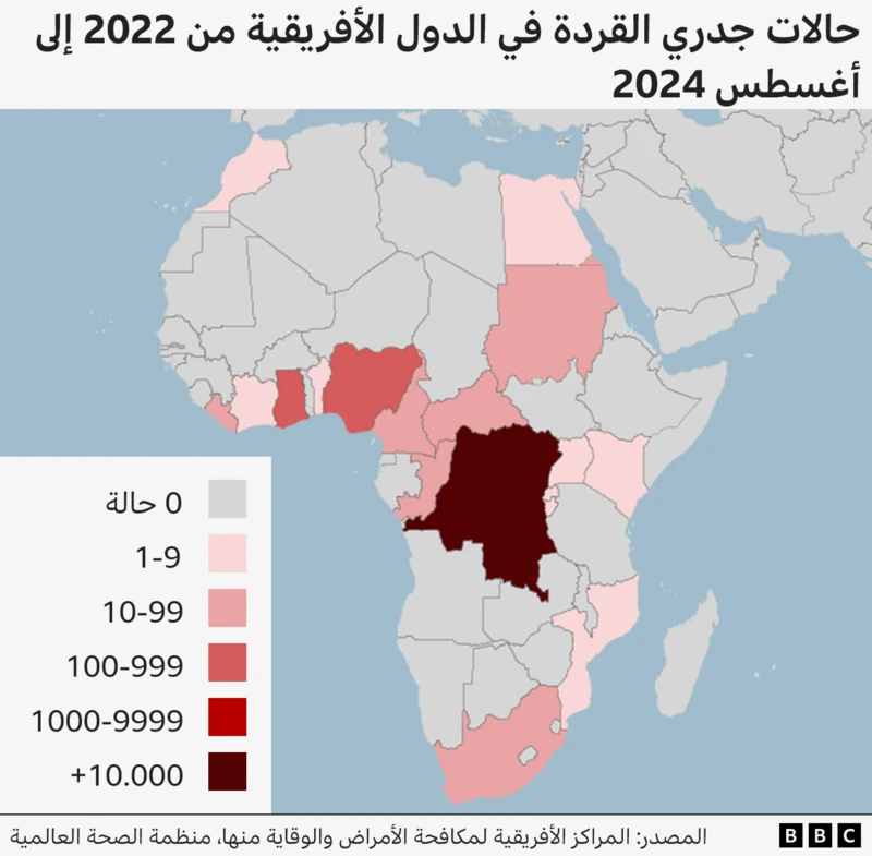 وتظهر 96 % من حالات الإصابة بجدري القرود في جمهورية الكونغو الديمقراطية، وبدأ المرض ينتشر بالعديد من الدول المجاورة، مثل بوروندي وكينيا ورواندا وأوغندا- حيث لا يكون متوطنا عادة. وتسببت سابقا سلالة أخف من جدري القرود توجد بغرب أفريقيا، في تفش عالمي في عام 2022. وانتشر المرض إلى ما يقرب من 100 دولة، من بينها دول في أوروبا وآسيا، ولكن سُيطر عليه من خلال تطعيم الفئات الضعيفة.