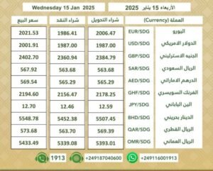 أسعار العملات الأجنبية مقابل الجنيه السوداني اليوم في يناير 15, 2025 تشهد اسعار العملات الاجنبية استقرار في البنوك مقابل الجنيه السوداني اليوم الأربعاء ، ادناه يوضح العملة والسعر Oplus_131072 شارك FacebookTwitterWhatsApp