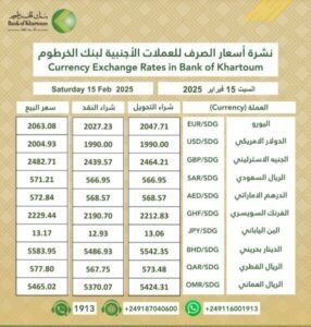 أسعار العملات الأجنبية مقابل الجنيه السوداني في فبراير 15, 2025 تشهد أسعار العملات الاجنبية مقابل الجنيه السوداني استقرار في البنوك التجارية ، حيث يتراوح سعر الدولار ما بين 2001 الى 2004 الجدول ادناه يوضح تفاصيل بقية الأسعار شارك FacebookTwitterWhatsApp