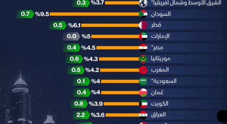 وبحسب بيانات صندوق النقد الدولي، تصدّر السودان قائمة الدول العربية بنمو 9.5%، تلته قطر بـ6.1%، ثم الإمارات بـ5%، ومصر بـ4.5%، في حين بلغ نمو السعودية 4%، والعراق 3.6%، بينما جاءت تونس في أدنى القائمة بنمو 2.1%.