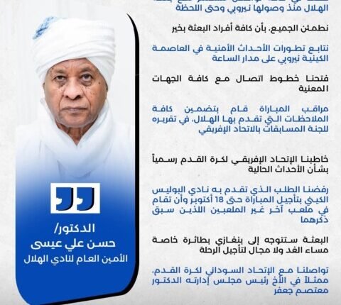 وقال الأمين العام في توضيحه أنهم خاطبوا الاتحاد العام السوداني، فيما يتابع الهلال تطورات الأحداث وما ستسفر عنه نتيجة التحركات التي قام بها بجانب المشاورات.