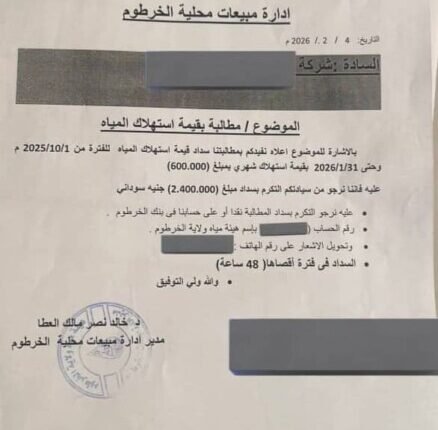 ” الهيئة ملتزمة بقرار والي ولاية الخرطوم بإعفاء مواطني الولاية من سداد فاتورة المياه خلال عامي الحرب، وان تحصيل فاتورة المياه الذي يجري حاليا لا يشمل القطاع السكني.