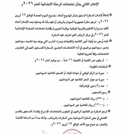 سفارة السودان بالسعودية تعلن قيام امتحانات الشهادة الابتدائية بالرياض وتحدد الشروط