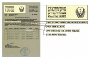 إلا أن مصدرًا فضل عدم ذكر هويته، مد فريق تحرير مراقبون بنسخة من شهادة التوصيل المذكورة آنفا. وتم إصدار هذه الوثيقة في يوم 16 أغسطس 2020 من قبل القيادة العامة للقوات المسلحة في الإمارات العربية المتحدة والتي كانت مليئة بالمعلومات القيمة حول عملية التسليم. ونعلم من خلال هذه الوثيقة أن الطرف الأخير المستلم لقنابل الهاون بلغارية الصنع هو جيش الإمارات العربية المتحدة نفسه.
