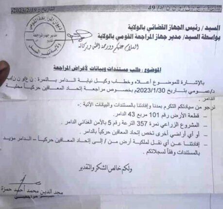 بالإشارة للموضوع أعلاه، وخطاب وكيل نيابة الدامر بالنمرة: (ن ع/ ون ن/ ب/ د عمومي)، بتاريخ 30/1/2023 بخصوص مراجعة إتحاد المعاقين حركيا محلية الدامر.. نرجو من سيادتكم التكرم بمدنا وإفادتنا بالمستندات والبيانات التالية: