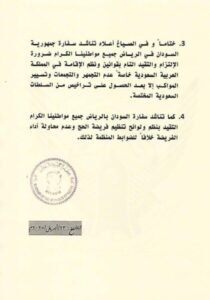 ورحبت السفارة في بيان، بتمديد المملكة تأشيرات الزيارات للمواطنين السودانيين، وقالت: نناشد جميع مواطنينا الكرام ضرورة الالتزام والتقيد التام بقوانين ونظم الإقامة في المملكة العربية السعودية خاصة عدم التجمهر والتجمعات وتسيير المواكب إلا بعد الحصول على تراخيص من السلطات السعودية المختصة.