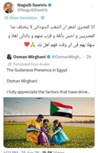 وكتب نجيب ساويرس ، عبر حسابه بموقع أكس: أنا كمصري أشعر أن الشعب السودانى لا يختلف عنا كمصريين وأحس بألفة وقرب منهم وبالتالى أهلا وسهلا بهم فى أى وقت فهم أهل بلد.
