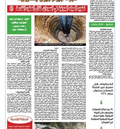 وللحق التحقيق ممتاز وفي غاية الأهمية، خاصة أنه ضرب على وتر، ضرورة الحفاظ على المخزون الجوفي من المياه الجوفية للأجيال القادمة لكونها ليست ملكا للجيل الحالي وحده.. وتأكيدا على ذلك أن كل شخص لديه فدان فدانين قام بحفر بئر إرتوازية لريها بطريقة عشوائية ومن دون تصديق من الجهات الفنية المختصة، ما يهدد مخزون المياه الجوفية وبالتالي قد يتسبب في تصحر الأراضي وتمدد الزحف الصحراوي على الأراضي الزراعية، هذا بجانب ما يسمى بـ(الدربات) التي إنتشرت ببعض قنوات الري الواقعة غرب مشروع الجزيرة بحجة عدم وصول المياه لأراضي المزارعين بتلك المنطقة، وهذه الدربات تسحب المياه من القنوات بطريقة غير مشروعة وتتسبب بأخطاء في حساب كميات مياه الري الحقيقية المسحوبة من خزان سنار عبر النيل الأزرق.. كما لاحظت لدينا بالولاية الشمالية مئات الآبار الإرتوازية العميقة يتم حفرها في الخلاء من دون رقيب او حسيب وبالطبع فهي تقلل كثيرا من إحتياطي المياه الجوفية بمرور السنوات وتقلل كثيرا من نصيب الأجيال القادمة من المياه الجوفية.. وأضم صوتي لصوتكم حسب ما ورد بالتحقيق، بأنه يجب على السلطات الرسمية المختصة تفعيل قوانين حماية المياه الجوفية بحيث تكون العقوبة مشددة لكل من يحفر آبارا جوفية عشوائية من دون التصديق من الجهات الفنية المختصة.. وفقكم الله أستاذ، التاج عثمان، فيما تثيرونه دوما من قضايا حيوية مهمة غائبة عن الكثيرين.