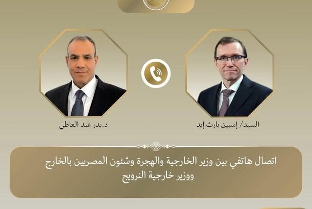 وجرى اتصال هاتفي بين د. بدر عبد العاطي وزير الخارجية والهجرة وشئون المصريين بالخارج، والسيد “إسبين بارث إيد” وزير خارجية النرويج يوم السبت ٢٧ ديسمبر ٢٠٢٥، لتناول مستجدات التطورات الإقليمية.