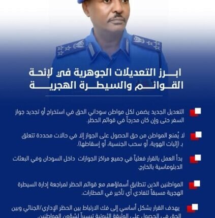 وأوضح العميد فتح الرحمن أن هذا الحق يظل مكفولاً للمواطن بشكل كامل ولا يُستثنى من ذلك إلا الحالات التي يكون فيها الحظر متعلقاً بـ”إثبات الهوية، أو إسقاط الجنسية، أو سحبها”، وما دون ذلك فإن إجراءات الحصول على الجواز أصبحت متاحة للجميع وفق الضوابط الجديدة.