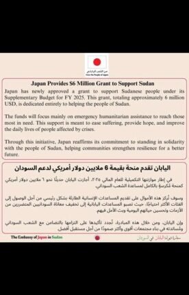 قررت الحكومة اليابانية تقديم منحة للعون الإنساني للسودان بقيمة 6 ملايين دولار.